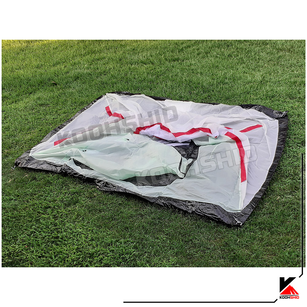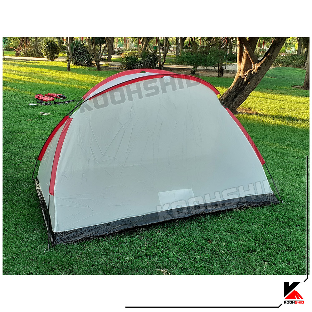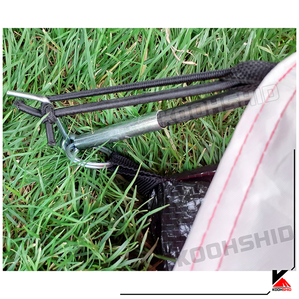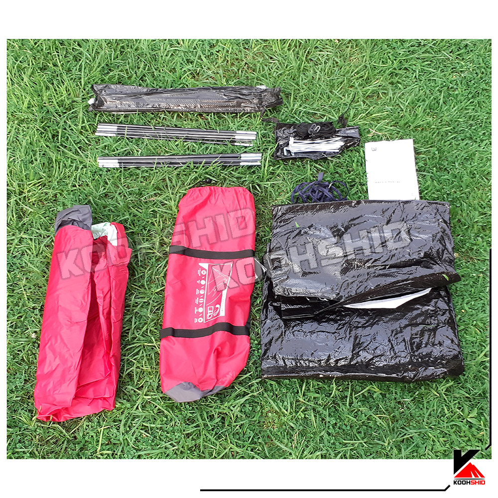 در ضمن این چادر باتوجه به ساختار و طراحی آرگونومی خود میتواند در شرایط بارانی آب را به سمت پایین هدایت کرده و مانع جمع شدن آب روی چادر شود. تیرک های این چادر از جنس فایبرگلاس انعطاف پذیر با لبه های فلزی است که با کش به هم متصل شده اند.
